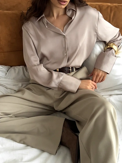 Трендовая атласная женская рубашка Гленда отлично впишется в гардероб современной женщины или девушки-подростка. Рубашка имеет современную посадку оверсайз. Молодежная однотонная гладкая блузка станет вашей базовой вещью, которая станет основой для множества стильных осенних образов. Бежевая рубашка oversize на пуговицах выполнена из 100% полиэстера премиум качества. Ткань имеет плотную легкую мерцающую структуру, которая смотрится дорого и изыскано. Наша универсальная повседневная модная рубашка с объемными пышными длинными рукавами создана для удобного стиля на каждый день. С ней можно обыграть праздничный вечерний нарядный образ, а также создать образ в институт. За счет свободного широкого покроя шелковый батник в стиле винтажного бохо подойдет для любого типа фигуры. Классическая удлиненная офисная модель с воротником пойдет для делового образа на Новый год.