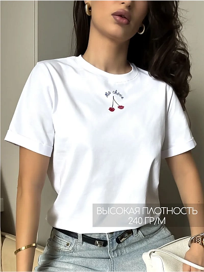 Футболка женская Амабель - актуальная базовая вещь современного гардероба. Прямая стильная футболка выполнена из мягкого приятного к телу плотного хлопка, будет актуальна в любое время года под пиджак. Модная летняя футболка из pinterest с принтом отлично садится по фигуре. Отлично подойдет на каждый день в качестве классической деловой одежды для офиса. За счет добавления лайкры футболка в стиле coquette с рисунком вишни хорошо держит форму, не мнется и сохраняет первозданный вид даже после множества стирок. Универсальная нарядная модель casual легкий оверсайз женской базовой однотонной свободной майки y2k из пинтерест с коротким рукавом комфортна и не будет сковывать движения, а также подойдет для девочек подростков весной и летом.