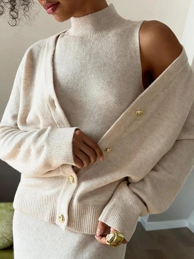 Костюм женский Николь из длинного трикотажного платья и кардигана — тренд сезона осень-зима 2025. Вязаная фактура материала обеспечивает тепло в прохладную погоду, идеально подходит на осень зиму демисезон. Платье имеет облегающий силуэт в обтяжку и длину макси в пол. Кардиган на пуговицах оверсайз фасона можно носить как в комплекте с платьем, так и самостоятельно как кофту или утепленный жакет. Костюм двойка подчеркивает женственность и подходит для создания образов на праздник или вечернее мероприятие. Платье макси maxi с накидкой выполнены в стиле old money олд мани - элегантно и сдержанно, что соответствует современным модным трендам пинтерест Pinterest и подходит как для повседневной носки, так и для вечерних выходов, 1 сентября в школе благодаря своему эффектному виду. Комплекты с платьем являются модной и современной альтернативой юбочным костюмам. Платье с кардиганом прекрасно подойдет для девушек и женщин любого возраста, учителей, а также для беременных и plus size благодаря комфортному крою и эластичности ткани.